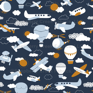 Sky travel on a dark blue background. Airplanes, hot air balloons, helicopters, and clouds are all flying in the sky. Cute boys nursery pattern.