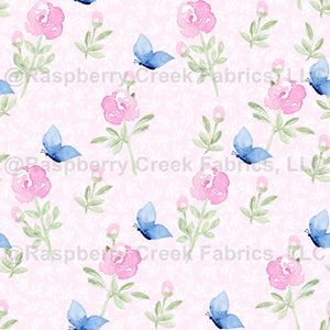 Watercolor painted pink Roses with blue butterflies on pale pink with white foliage texture. Rose flowers are appx 2" across at 150 dpi scale, and appx 1" across at 300 dpi scale.
