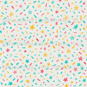 Playful watercolor sprinkles, dots, and doodle flowers scattered on a cloud dancer white ivory background.