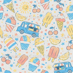 Playful watercolor summer treats with ice cream trucks, popsicles, cherries, and sunshine in a bright tossed layout.