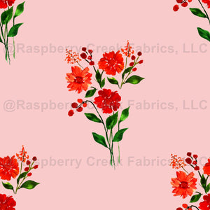 Small watercolor red flowers floral arrangement with flower buds and deep green leaves on a pink background.