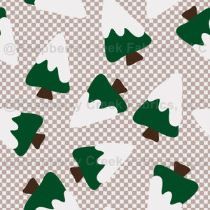 Snow capped green trees Christmas beige checkerboard. Dense tossed subtle christmas fir spruce forest. Perfect for Quilting, Home Décor, or fun pieces of clothing. Fits Christmas, cabin, wood, hunting, nature, outdoor themes.