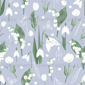 Snowdrops, Tulips and Lily of the valley on ice blue.