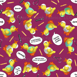 Funny little ditsy yellow ducklings in teal and white scrubs crack puns on this raspberry design for medical professionals that can be scaled down to a 12 inch repeat or scaled up for larger designs.