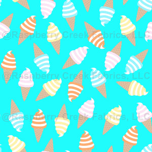 Dessert time! Rainbow swirl ice cream sits on yummy waffle cones in yellow, pink, orange and pink on a bright blue background. Available in multiple colors.