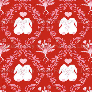 Modern handdrawn double damask pattern with valentine bunnies and dandelions on moderate scarlet red background.