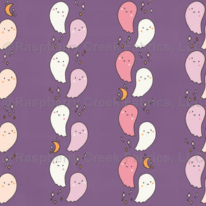 A fun, retro-inspired vertical stripe pattern featuring cute, spooky ghosts! In purples, pinks, oranges, and rust.