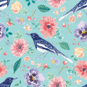 Spring Fling Magpie Meadows: hand-painted watercolor magpie birds, pink gerbera daisies, purple pansies, and peach flowers on an aqua blue background