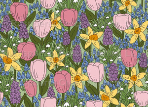 This design features pink tulips, yellow daffodils, purple hyacinth, white snowdrop and blue muscari flowers to make a beautiful garden.