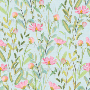 A delicate pattern with hand drawn pink flowers.