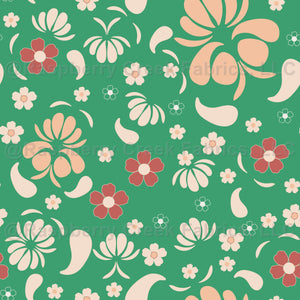 Spring Whimsy Floral Bright Green. Soft pink, peach, and cream flowers on a bright green background. Flowers, paisleys, scattered layout, abstract flowers, multidirectional layout, romantic, feminine floral pattern on spring green background.