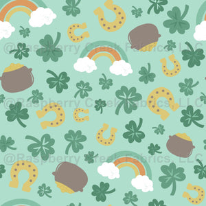 St Patrick’s Day, shamrock, rainbow, pot gold, horseshoe on minty green