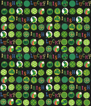 St. Patrick's Day Collection: Green Irish four leaf clover, hat, pot of gold and horseshoe inside circles with the word Irish in orange, yellow, blue, green and red plaid letters.