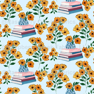 Stacked Books And Blue Vase With Orange Flowers perfect for rococo and coquette aesthetic for teacher, book lover, library, librarian, book store in light blue