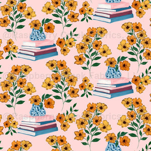 Stacked Books And Blue Vase With Orange Flowers perfect for rococo and coquette aesthetic for teacher, book lover, library, librarian, book store in light pink