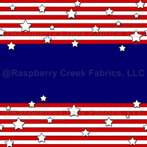 This design features groups of narrow red and white stripes with larger blue stripes between, and white stars in various sizes scattered over the stripes.