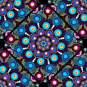 Colourful dot mandala diamond tile pattern using our Starry Night palette on a black background. Abstract floral Aboriginal art with a modern touch.