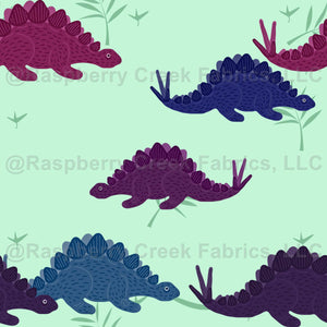 Blue and purple stegosaurs browse on a mint green background.
