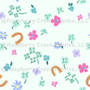 Stitched with luck, st Patrick’s day, girls, kids, women, cross stitch, mint green, ditsy floral, clovers, kids apparel, pink, purple, spring, mint green, green