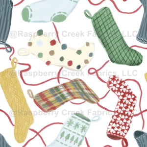 Stockings, kids, family, Christmas, holiday, winter, whimsical, hand drawn, red, white, green, blue, yellow