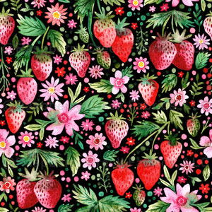Strawberries and Flowers Painted in Loose Watercolor on Black (Ditsy)