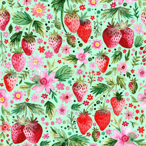 Strawberries and Flowers Painted in Loose Watercolor on Green (Ditsy)