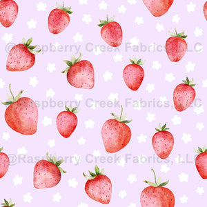 Strawberries and mini flowers on lilac background. Watercolor summer design for girls. Strawberrygirl collection by Zanetfromwonderland
