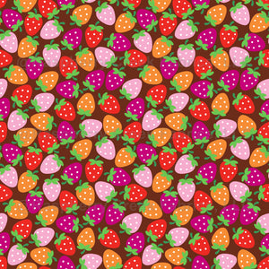 Red, orange, cyclamen and pink strawberries with white dots and green leaves on a brown background.