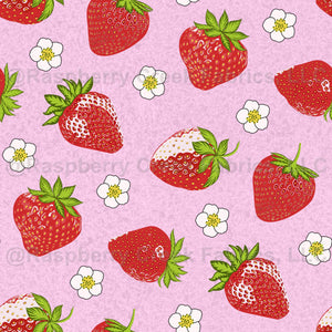 Red ripe strawberries floating on a bubblegum pink, textured background. Positively PINK.