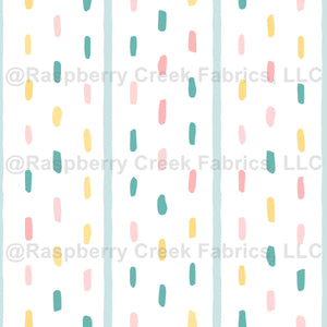 Stripes and dashes with an emphasis on the baby blue color. Also features baby pink and yellow and teal on a soft white background