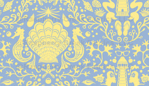 Light yellow double damask pattern with seashells, seahorses, lighthouses, seaweed and mermaids on powder blue background.