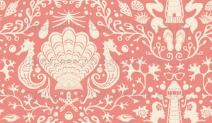 Modern double damask pattern with seashells, seahorses, lighthouses, seaweed and mermaids on coral background.