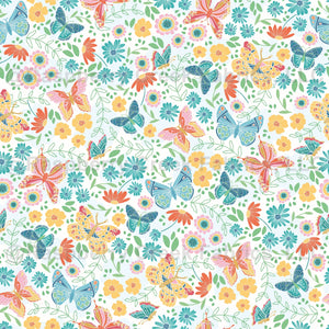 A lovely nature inspired floral of wildflowers and butterflies in shades of soft pink, yellow, blue and teal on a light blue background.
