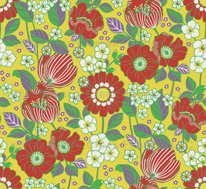 Summer retro blooming tulips, daisies, poppies and small garden flowers in white, red, green with purple, green leaves on a yellow background.