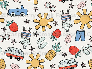 Bold and playful summer vacation pattern, featuring swimsuits, suns, popsicles, strawberries, camper vans, convertibles, flip flops, and starfish.