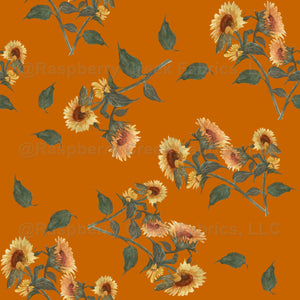 A multitude of sunflower floral motifs with orange and yellow blooms with green leaves are evenly distributed across a dark orange background. The repeating pattern gives a wallpaper or fabric-like appearance and conveys a vintage vibe.