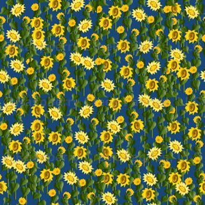 Hundreds of yellow sunflowers with green foliage all blooming together in a seamless design on patriot blue.