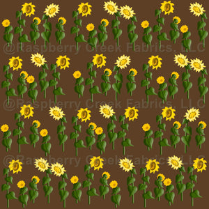 Pretty rows of sunflowers grow and bloom brightly on mudlark brown.