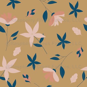 Sunny Day Pink and Navy Floral Flowers on Mustard Yellow Background Wallpaper