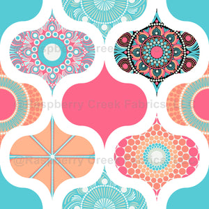 Mid century modern patchwork in this ogee cheater quilt pattern using dot mandalas from our Sunset on Sea color palette collections.