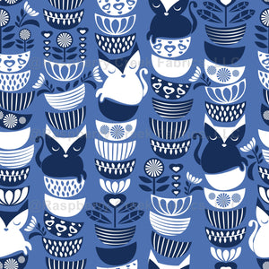 Sweet blue pattern with cute kitties, bowls of cereals and some Swedish motifs.
