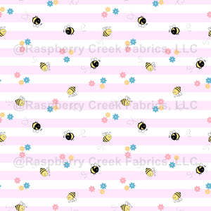 Cheerful bees buzzing along soft floral and stripes in pastel hues. Ideal for kids' accessories, clothing, nursery decor and walls.