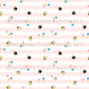 Cheerful bees buzzing along soft floral and stripes in pastel hues. Ideal for kids' accessories, clothing, nursery decor and walls.