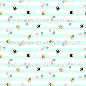 Cheerful bees buzzing along soft floral and stripes in pastel hues. Ideal for kids' accessories, clothing, nursery decor and walls.