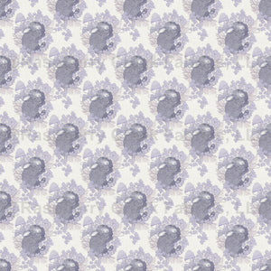 This sweet bunny is just taking a little snooze among the flowers and mushrooms in various shades of purple and lavender with a slight woven texture. Large scale print available.