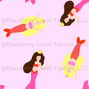Majestic mermaid queens float peacefully in a pink sea. Featuring patterned tails and delicate crowns. Trendy and cute! Part of a collection and available without crowns