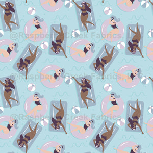 "Swimming Pool Party" is a lively and energetic seamless pattern featuring illustrations of a vibrant swimming pool party scene. This design captures the excitement and fun of a poolside gathering with people enjoying the water, floating on inflatables, and basking in the sun. Perfect for projects that evoke the carefree spirit, sunshine, and joyous atmosphere of a pool party.