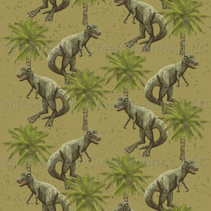 T-rexes and coconut palms create a seamless repeating print on gold khaki.