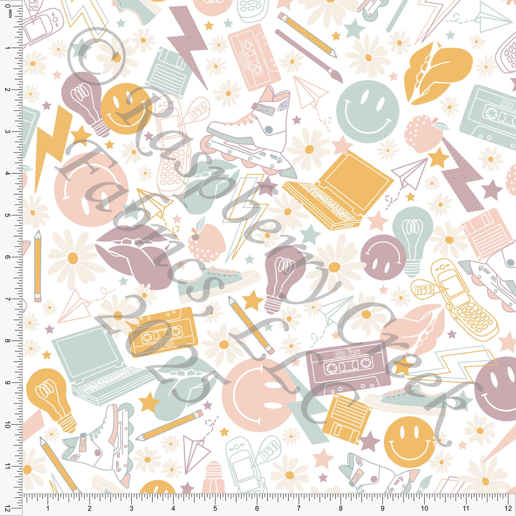 Mustard Peach Pink Steel Blue and Dusty Purple 90s School Supplies Print Fabric, School Is Cool By Kim Henrie for CLUB Fabrics