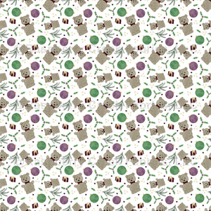 Playful watercolor style Christmas holiday design featuring beige brown teddy bears, gifts, ornaments, holly and pine branches on a white background.Green, Red, Purple and white. Fabric, Wallpaper, home decor. Hero for the Teddy Bear Christmas collection
